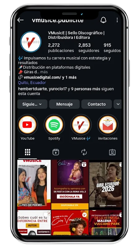 ¿listo para impulsar tu música? ¡Haz parte de la familia Vmusice ya! Somos expertos en PlataformasDigitales Plan de Marketing Servicio Editorial Gira de medios NUEVOS LANZAMIENTOS MusicVaneza Cevallos Publicista con más de 25 años de experiencia en todos los campos de la industria musical. Fundadora y directora de Vmusice Inc, agregador ecuatoriano con un catalogo que supera las 10.000 canciones y 300 artistas en distribución digital. Contáctame vmusice1@publicitecuador.com Escríbenos a WhatsApp Síguenos en nuestras redes